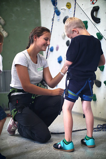 Lerne die Grundlagen des Sicherns für das Klettern im Toprope mit großen und kleinen Menschen.